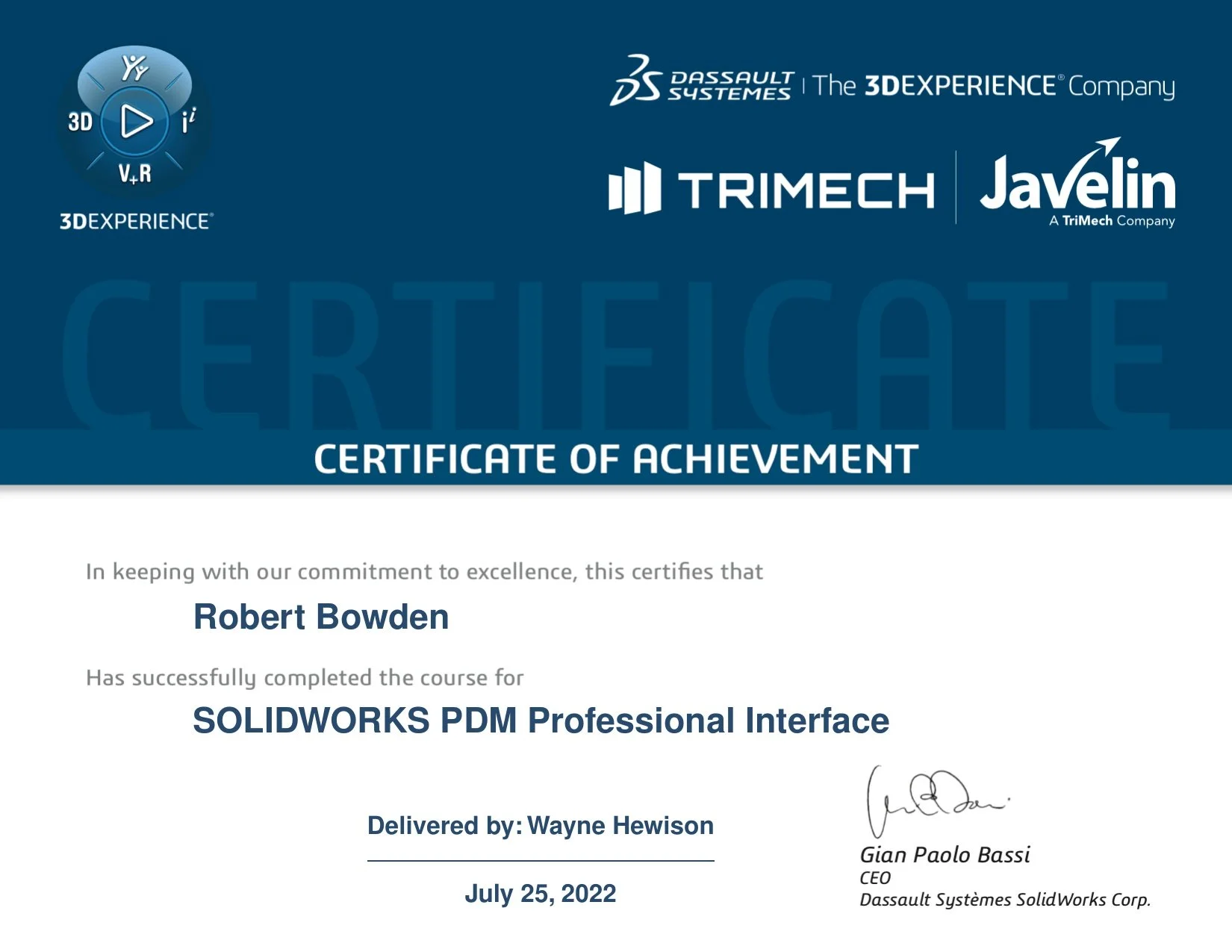 As a Certified SOLIDWORKS PDM Professional Admin, you have demonstrated the ability to configure, manage, and support SOLIDWORKS PDM environments, including vault administration, workflows, user permissions, file management, and data control processes.