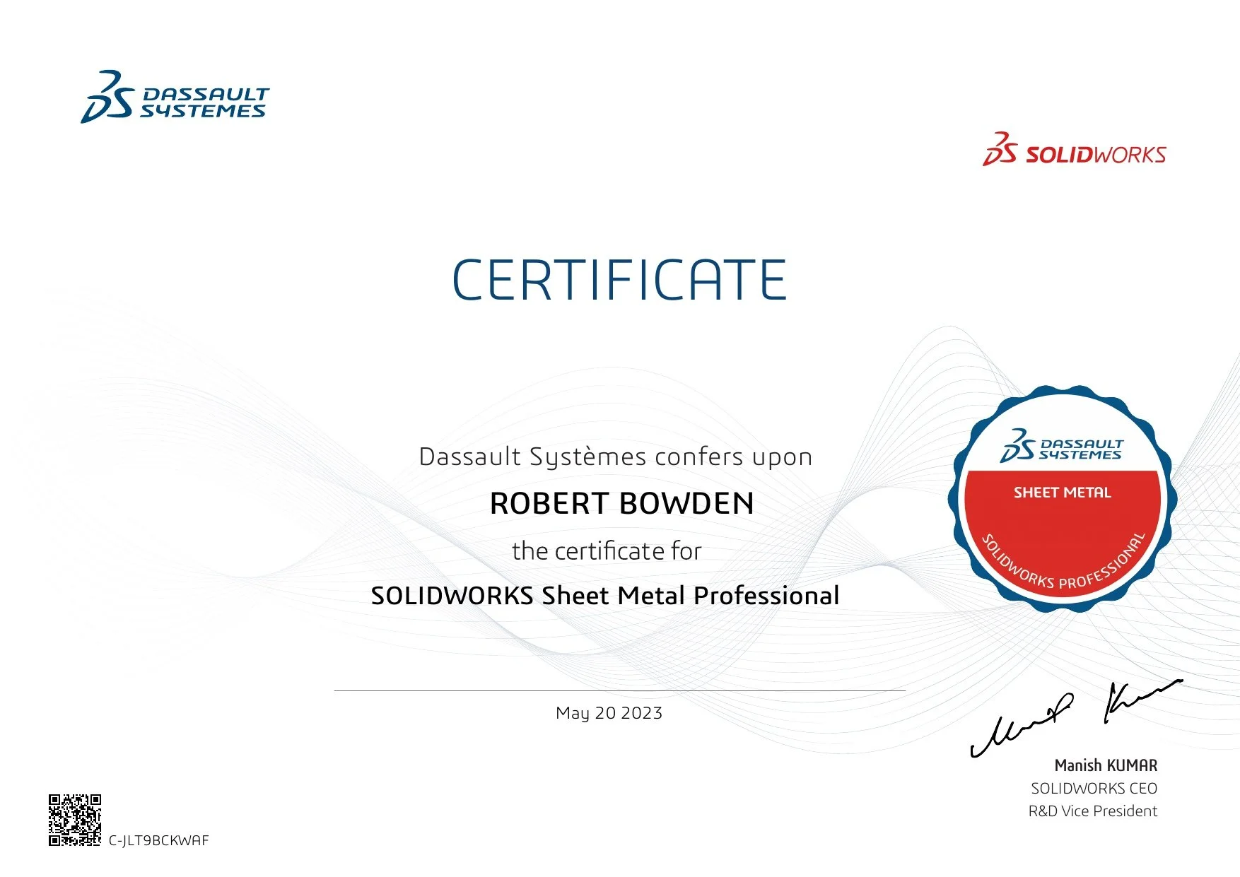 Certifications are more than badges — they represent verified knowledge in advanced SOLIDWORKS modeling, sheet metal design, weldments, surfacing, drawings, and PDM workflows.